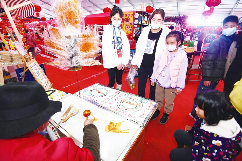 1月13日,在贵阳市南明区花果园兰花广场举办的“黔货辞旧岁·新春享优惠”2023贵州新春年货节上,前来采购年货的群众络绎不绝,现场年味十足,呈现出一派热闹、祥和的新春消费氛围。图为小朋友们正在观看糖画制作技艺。