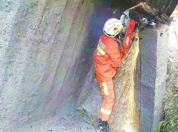舒红刚正在切割解救被困在侧翻大货车里的人员。 1994年11月出生的舒红刚,对于消防事业,有着一腔热血。