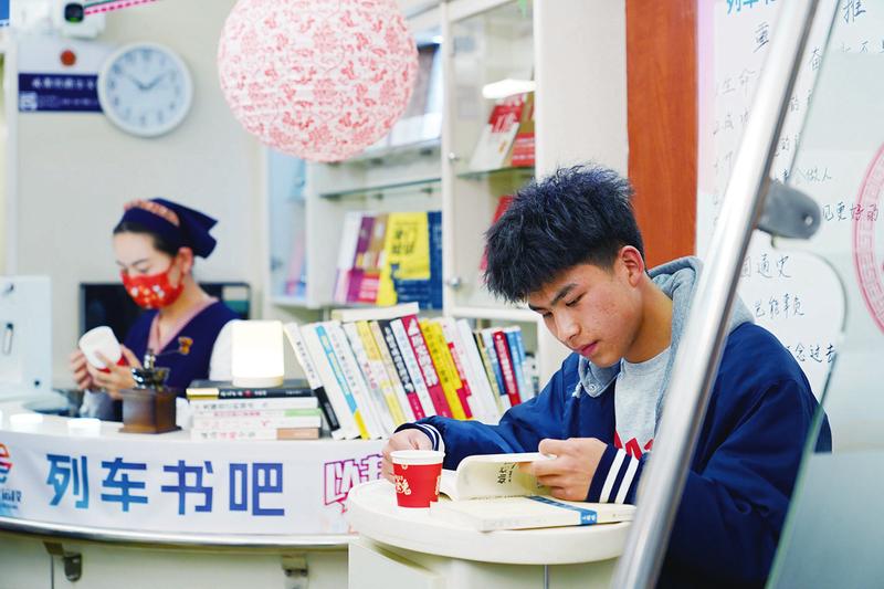 2月9日晚,中国铁路成都局集团有限公司贵阳客运段在贵阳开往北京西的Z150次列车上重新开启间断3年的“列车书吧”,吸引乘坐该列车返校的大学生前往阅读书籍。Z150次列车经过湖南、湖北、北京等省市,沿途涉及高校近400所,是部分大学生开学季返校乘坐的首选车次。自2015年起,列车餐车在夜间不营业时免费为学生开放,提供图书借阅、免费茶饮等服务。图为学生在Z150次“列车书吧”阅读书籍。