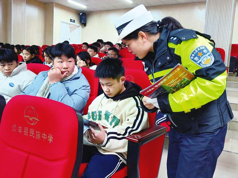 “同学们,上下学过马路要走斑马线,不要在路上追逐打闹。”近日,贞丰县公安局交警大队利用开学季,走进校园开展“开学第一课”宣传活动,民警通过典型案例为同学们讲解上下学时应该注意的交通安全事项,针对性地普及交通安全法律法规和安全常识,有效提升了学生们的安全意识、法律意识和自我保护意识。