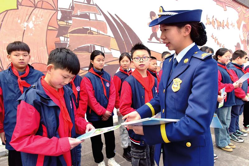 消防救援大队干部向学生发放《安全常识读本》。