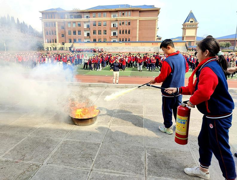 学生利用干粉灭火器进行灭火实战演练。 本报讯(通讯员 刘永松)2月13日,兴义市八中附小(阳光小学)在开学第一天举办了“消防安全第一课”主题教育活动——开展消防安全知识讲座、应急疏散演练和灭火实战演习。