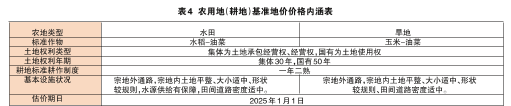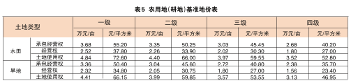 本次农用地基准地价的评估用途主要为耕地,根据土地权属性质,农用地基准地价又分为集体农用地基准地价和国有农用地基准地价。农用地(耕地)基准地价内涵和基准地价表,详见表4、表5。