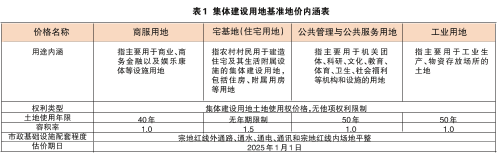 本次贵阳市六城区集体建设用地基准地价制订的地类包括商服用地、工业用地、宅基地、公共管理与公共服务用地四大类。集体建设用地基准地价内涵和基准地价表,详见表1、表2和表3。