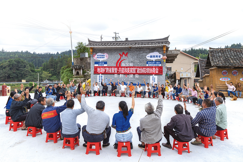 近日,湘黔两地的政协委员、群众代表围坐在天柱县地湖乡甄家慕自然寨院坝中,青山绿水下,“政协院坝协商会”开得激烈热闹,关于村寨发展的金点子层出不穷,曾经的“管理割线”已变成“连心纽带”。