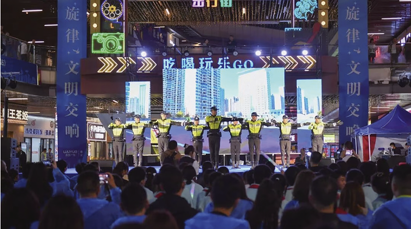 舞台展示区是交通安全知识的艺术传播阵地,民警邀请群众上来作安全头盔演示,让大家更直观地看到,只有符合国家标准的头盔才能保护头部安全。