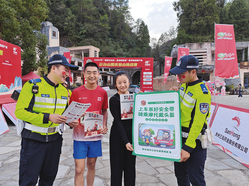 施秉交警以2025年“金秋云台山 奋进新征程”世界自然遗产地云台山国庆登山挑战赛为契机,向运动员、游客开展交通安全宣传。通讯员 李天天 陈利民 莫远鹏 摄 ■记者 常玥玥
