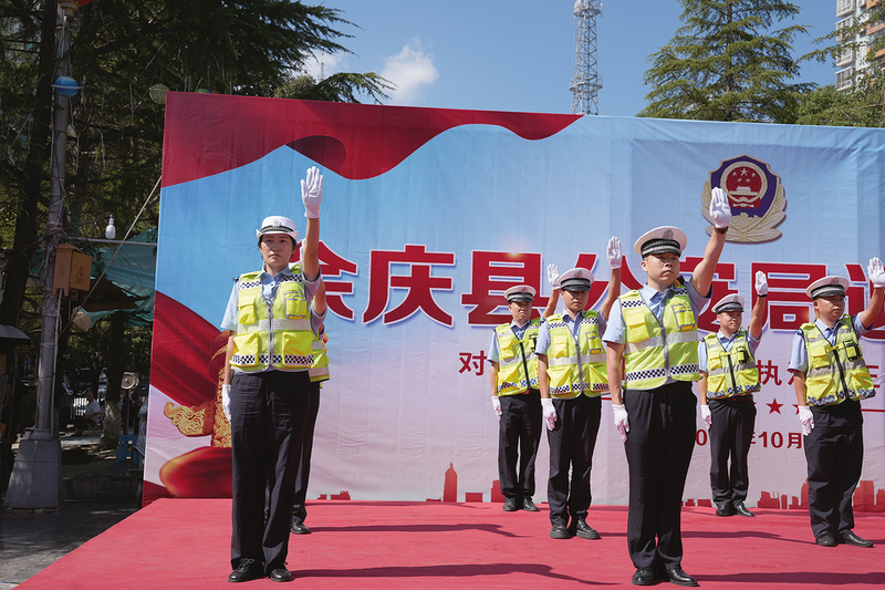10月11日,余庆县公安局在县城三角花园广场开展的“双提升”集中宣传活动上,该局交警大队表演的交通指挥手势操演练以标准的手势展示了日常工作中的指挥技巧和严谨的工作态度。