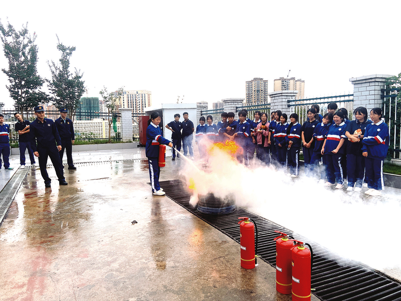 “灭火器怎么用才能灭火?”带着这些疑问,师生们开启了趣味十足的消防体验环节,亲身感受消防员的日常工作。在消防服试穿区,同学们争先恐后地体验,大家依次穿上消防战斗服、戴上头盔、系好腰带;在室内消火栓操作区,消防员详细讲解了消火栓的组成、出水流程及注意事项,师生们分组上前实操,亲手打开阀门、握住水枪,感受水流喷出的力量;在灭火器体验区,大家通过“实战演练”掌握了“提、拔、握、压”的灭火步骤,成功扑灭模拟火点,切实提升了应急处置能力。