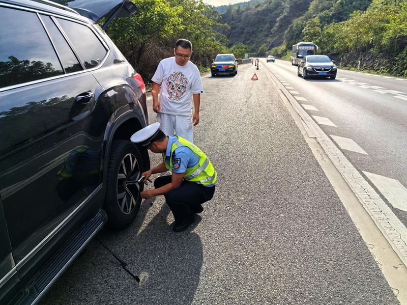 近日,黔南州公安交通管理局高速六大队民警在辖区兰海高速开展巡逻工作时,发现一辆小型轿车停在紧急停车带上。巡逻民警经询问得知,来自重庆的何先生一家去广西防城港旅游返回途中,行驶到该路段后因为该车左后轮爆胎,无法继续行驶。车辆需要换胎,但是车内工具不够,且不会换胎,何先生焦急万分,正准备报警求助。了解情况后,民警立即从警车内拿出携带的工具帮何先生更换备胎。