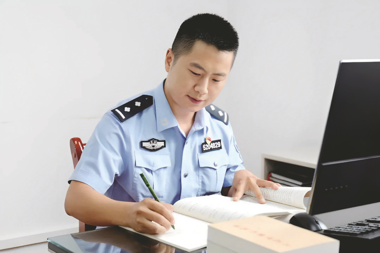 彭元庆不仅是集中学习的积极参与者,更是理论学习的努力践行者。在执勤的短暂间隙,常见他潜心研读党的创新理论。一本页脚微卷的厚厚笔记本,密密麻麻、字字工整,记录着他点滴的思考感悟与深刻的心得体会。“只有真正学深悟透,才能在行动中做到知行合一。”这是彭元庆常挂在嘴边的话,也是他笃行不怠的准则。