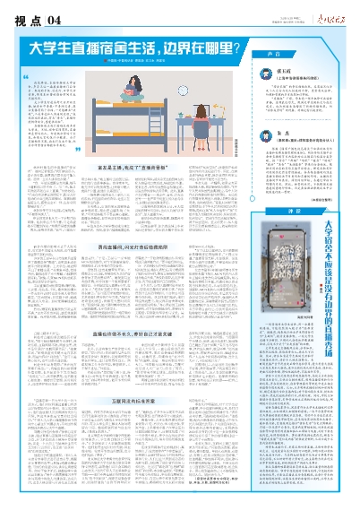 宿舍不应该是没有边界的直播秀场,高校应当承担起管理主体责任,尽快出台相关规定,明确直播空间和行为的边界,并在校规校纪、宿舍管理条例等规范中建立相应的监督与惩处机制。比如,应当明确直播的时间和空间限制、规范直播行为和直播内容;对于影响集体生活、侵犯他人隐私、扰乱校园秩序的行为,依规处理。同时,学校应加强媒介素养教育,引导学生树立正确的网络行为观念,明晰镜头前后的伦理底线。