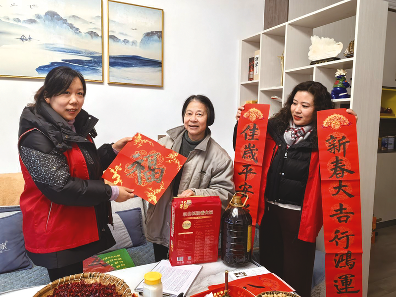 王作凤(中)和社区人员一起欢度春节。 ■ 记者 牟岚