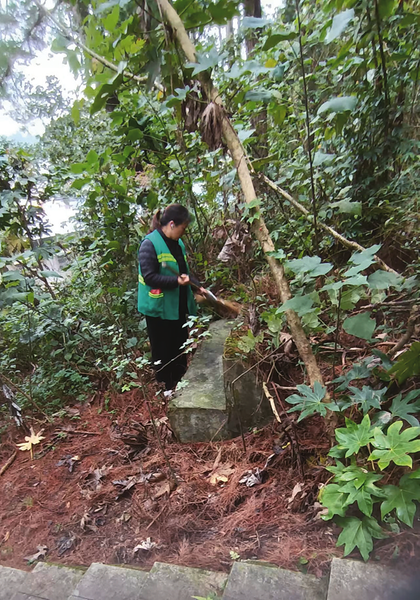梅兰山公园工作人员上山清理石椅青苔。 ■ 记者 瞿浩然