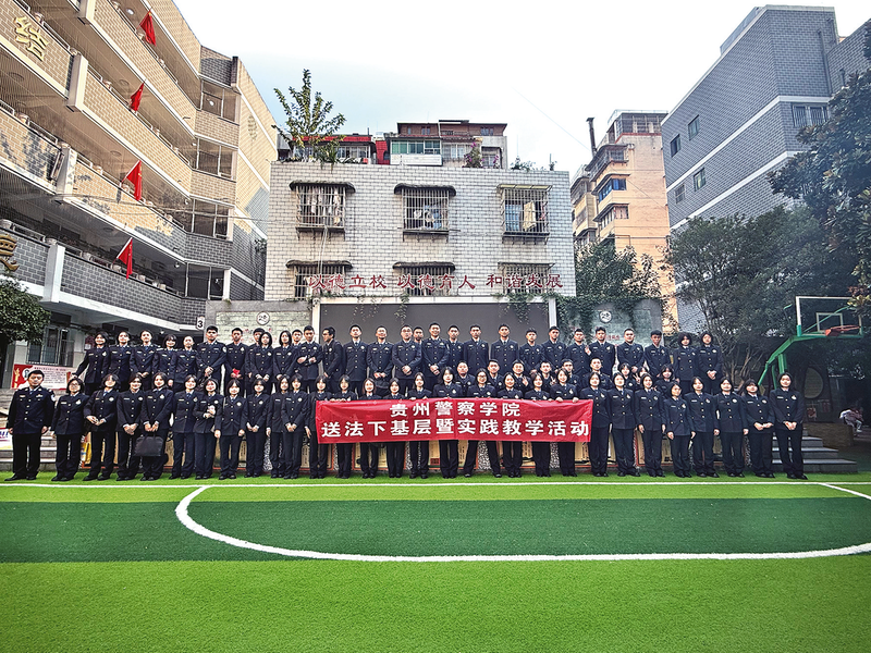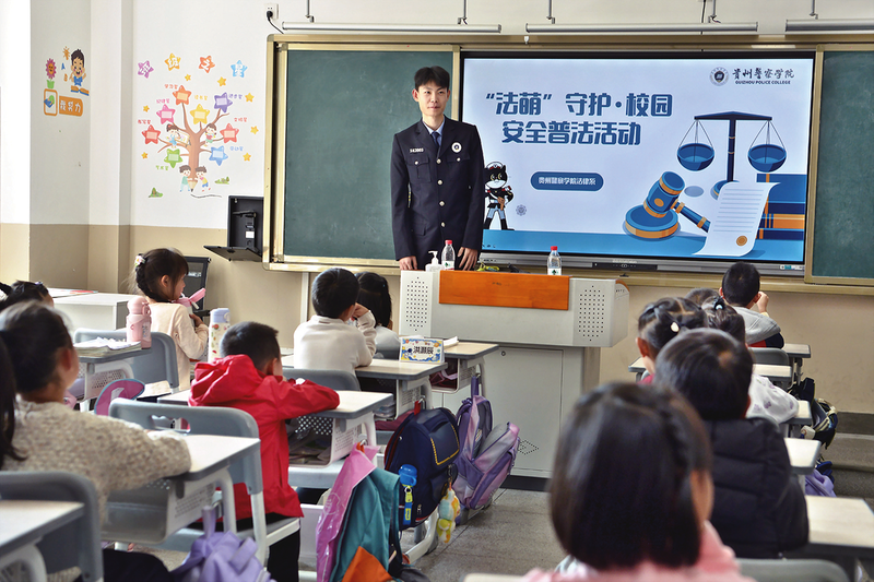 在与同学们并列的队列里,贵州警察学院法学系大二年级数十名学警,当天下午将成为同学们的“年轻教师”,在启动仪式结束后,他们走进青秀校区一年级至六年级的各班教室,把大学课堂上学习到的法律原理、条文规范等专业知识,转化为通俗易懂的语言,教授给小朋友们。