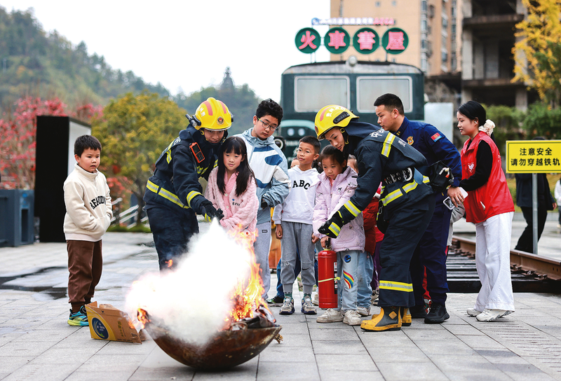 11月9日,玉屏自治县消防救援大队组织消防员来到皂角坪街道紫气山社区火车书屋广场,向当地群众讲解消防安全知识,提升大家的安全意识。图为消防员指导小朋友正确使用灭火器。
