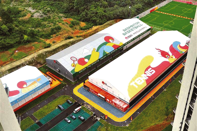 更让大家不满的是位于小区中的体育场。记者看到,该体育场被一个大型白色篷布结构所覆盖,业主称之为“大棚体育场”。