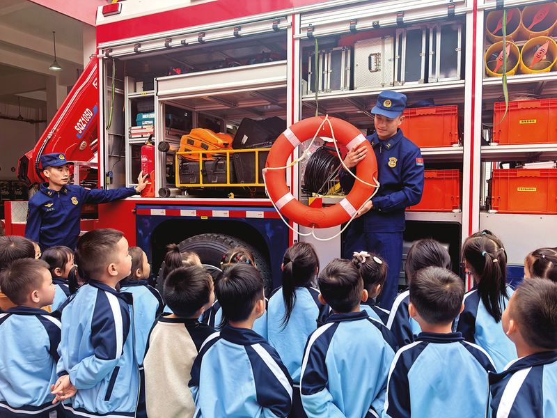 在实践探索中,黔西南州消防救援支队通过“走出去、请进来、抓重点”的工作思路,常态化推进“消防进校园”活动。消防指战员主动走进校园,为学生们送上“开学第一课”,系统指导学生掌握逃生自救方法、正确报火警流程、灭火器使用技巧等实用知识。秋季开学以来,该支队已深入90余所学校开展消防培训和应急演练,惠及10万余名师生。此外,全州13个消防救援站和6个消防科普教育馆长期面向学校师生开放,让师生零距离体验器材操作、烟雾逃生,以多元形式促进师生对消防知识的理解和掌握,让安全理念真正内化于心、外化于行。