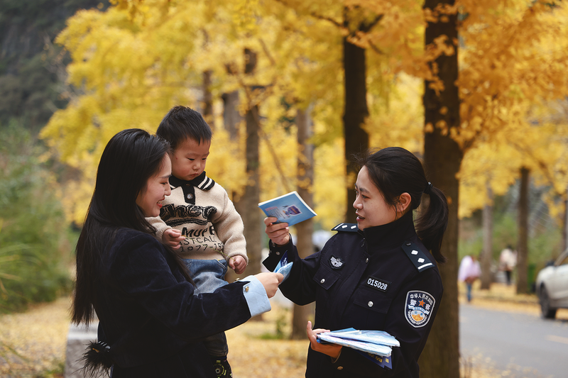 初冬的织金县平远古镇里,银杏染上鎏金,不少游客慕名而来。连日来,织金县公安局民警穿行在古镇中,排查隐患、回应咨询、发放反诈宣传册,为这幅秋日限定的鎏金画卷添上最踏实、最安心的守护底色。