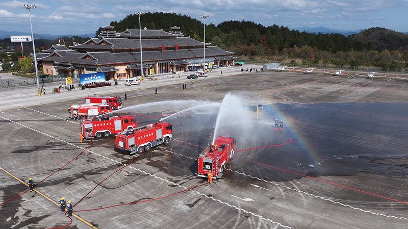 11月19日,凯里黄平机场联合多部门组织开展2025年应急救援综合演练。演练以“航空器着陆造成左侧机翼擦地后起火”为背景,采用“实战演练+同步解说”的形式进行。民航贵州监管局督导组全程督导,州、县相关单位及行业主管部门领导到场观摩,现场10余台消防车、救护车、警车整齐列阵,100余名救援人员整装待发,全面检验突发事件应急处置能力。