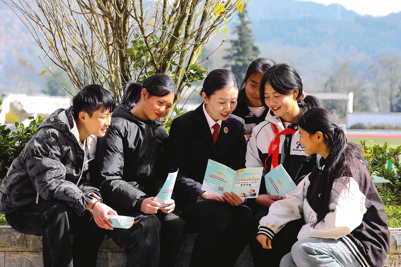 11月21日,黔西市人民检察院干警走进观音洞镇沙井中学开展法治教育活动,通过以案释法,为青少年成长注入法治正能量,织密校园安全防护网。图为检察干警课间为学生解疑答惑。