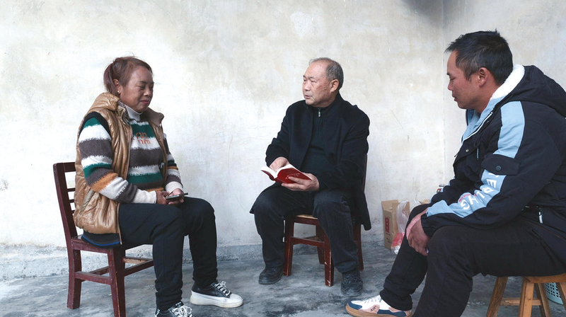 黄平县法律明白人王清华(中)为当地村民宣传讲解《民法典》。 ■ 记者 牟岚