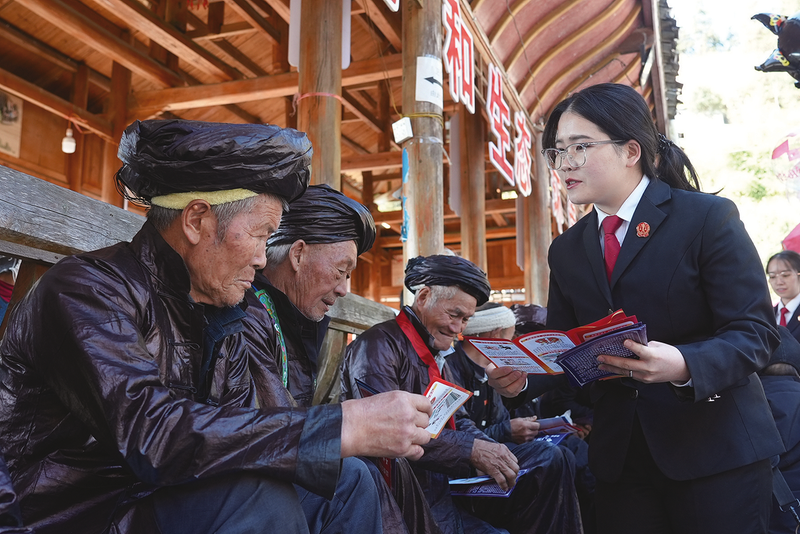近日,在榕江县兴华水族乡摆贝村举办苗年庆祝活动时,榕江县人民法院组织干警走进村寨长廊,通过法律宣传与民俗节庆相融合的模式,为当地群众送上“法治文化套餐”。
