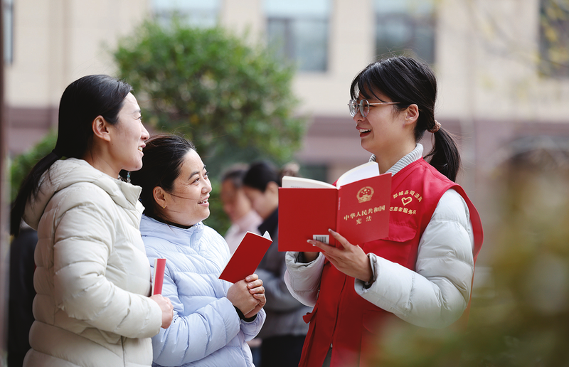 12月2日,在山东省临沂市郯城县郯城街道泉悦社区,郯城县司法局志愿者为居民讲解宪法知识。新华社发(张春雷 摄)