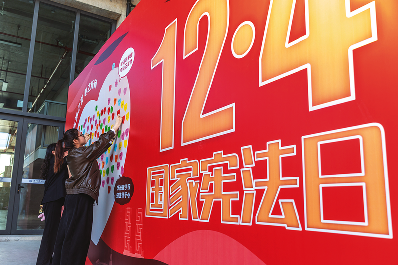 12月1日,在浙江省温州医科大学举行的温州市2025年“12·4”国家宪法日暨“宪法与浙江”主题宣传月系列活动启动仪式上,学生们在主题墙上签名。新华社发(刘吉利 摄)