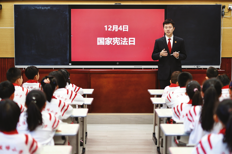 12月2日,在天津市滨海新区汉沽盐场小学,天津市滨海新区人民法院工作人员为学生们讲解宪法知识。新华社发(杜鹏辉 摄)