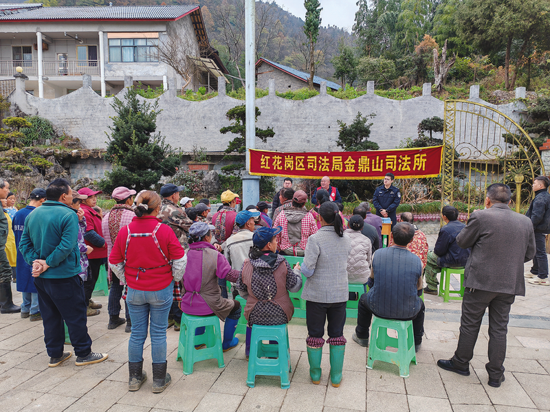 本报讯(记者 张斌)近日,一场由遵义市红花岗区司法局金鼎山司法所联合金鼎山镇综合治理服务中心、派出所开展的宪法宣传活动,在金鼎山镇金川村扇子林的院坝里火热进行。