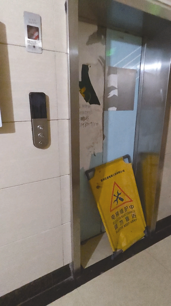 水映山城B2栋门口电梯摆放“维护中”提示牌。