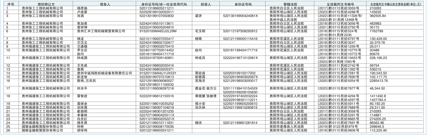 根据债权转让方贵州徐工工程机械有限公司、贵州瑞通徐工工程机械有限公司、国银金融租赁股份有限公司与债权受让方徐州徐工挖掘机械有限公司签订的债权转让协议,贵州徐工工程机械有限公司、贵州瑞通徐工工程机械有限公司、国银金融租赁股份有限公司将其享有的债权依法转让给徐州徐工挖掘机械有限公司(详见下列债权转让表),现以公告形式通知各债务人、担保人。请各债务人、担保人继续向徐州徐工挖掘机械有限公司履行还款义务。徐州徐工挖掘机械有限公司联系人:周升联系电话:185561688920516-83111210