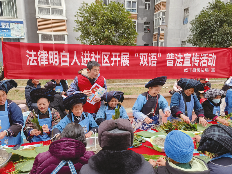 贞丰县水井湾社区“法律明白人”在端午节活动中用“双语”开展普法宣传。