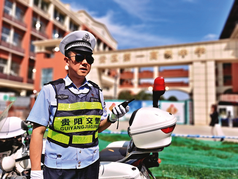 万恩平在高考考点护航考生安全。 ■记者 张斌