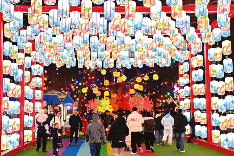2025年12月31日晚,贵阳市多彩贵州城景区张灯结彩灯火通明,丰富多彩的跨年夜活动吸引不少游客市民前来打卡。通讯员 乔啟明 摄(影像贵州)
