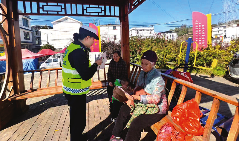 针对农村地区交通设施相对薄弱、群众安全意识参差不齐、农用车违法载人、面包车超员、无证驾驶等隐患突出问题,普定交警深入辖区乡镇村寨,以“摆地摊”“拉家常”的形式,在村委会广场、村口小卖部、田间地头搭建宣传“小课堂”。