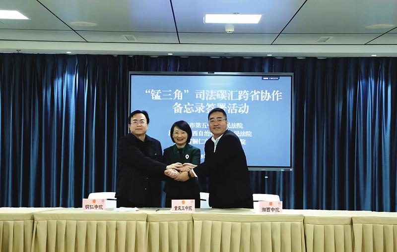 针对湘黔渝“锰三角”重金属污染治理难题,2023年8月,贵州铜仁、湖南湘西、重庆秀山三地法院、检察院及生态环境执法部门联合建立《“锰三角”跨区域环境资源执法司法保护协作联动机制》。2025年11月3日,铜仁市中级人民法院、重庆市第五中级人民法院、湖南省湘西自治州中级人民法院签署《“锰三角”司法碳汇跨省协作备忘录》,启动司法碳汇跨省协作机制,推动武陵山片区生态环境资源司法协作迈上新台阶。