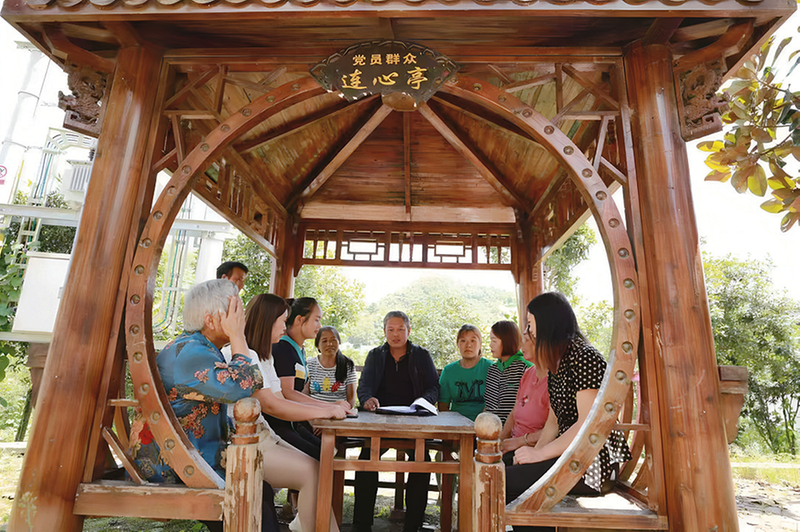 邹正军(中)在“党员群众连心亭”进行普法宣传。 ■ 记者 牟岚