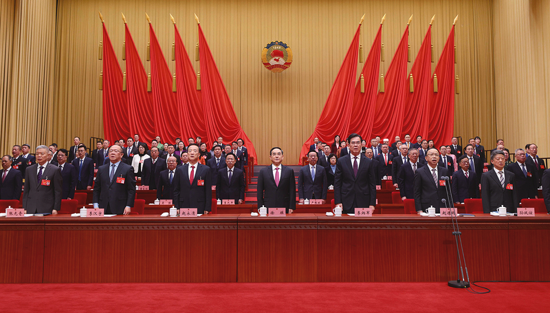上午9时,大会开幕,全体起立,高唱中华人民共和国国歌。