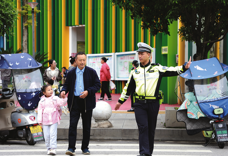 务川交警护送小朋友过马路。 ■ 记者 杨情丽 通讯员 王艺