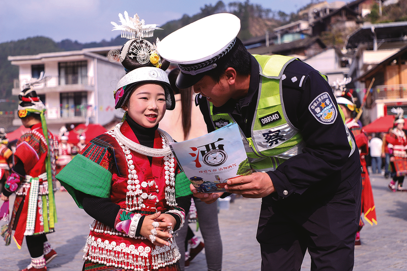 2月21日,丹寨县南皋乡九门村举办春节民俗村运会,精彩的民俗活动吸引了许多群众和游客前来观看。活动当天,当地交管部门以此为契机,组织民警走进活动现场,通过“拉家常”的方式,向群众宣传交通安全知识,提醒他们注意出行安全。