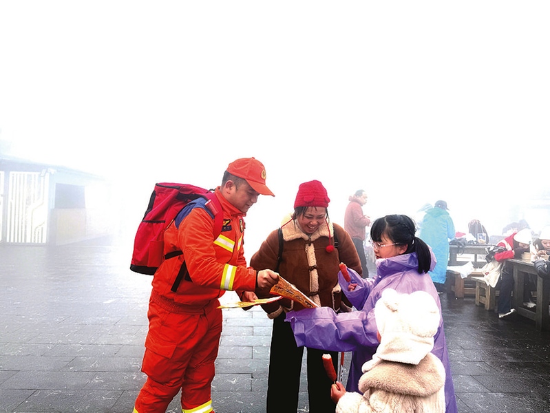 巡逻途中,队员们身兼数职,既是排查线路、商铺、观景台安全隐患的“安全员”,也是面对面提醒游客严禁野外用火、发放防火宣传资料的“宣传员”,更是为游客指路、搀扶老人小孩、提供应急帮助的“服务员”。