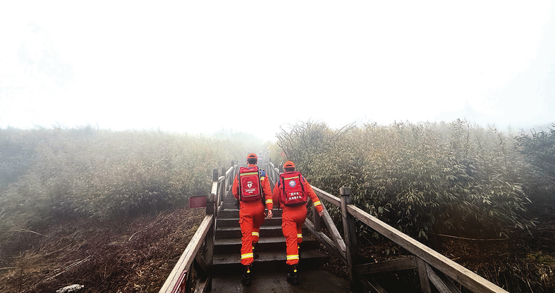 清晨的梵净山薄雾未散,队员们已整装集结,携带灭火救援装备与便民服务物资奔赴各执勤点位。在普渡广场、红云金顶、蘑菇石等核心景点和人流密集区域,队员们开展徒步巡防、动态执勤,每日往返数千级台阶,穿梭在山林步道与游客之间。