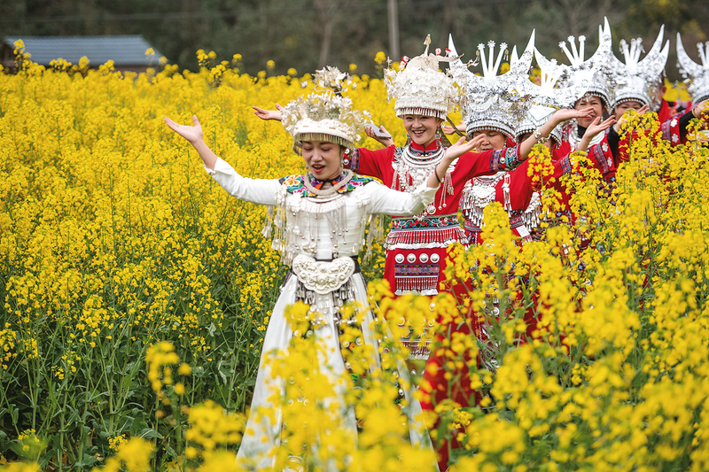 三月以来的贵州天柱,9.4万余亩油菜花竞相绽放,连绵的花海与青山村舍相映成趣,勾勒出一幅生机盎然的春日画卷。天柱县各乡镇以花为媒、以节会友,不仅展现了乡村振兴的美丽图景,更让文明新风吹进了田间地头。图为天柱县瓮洞镇光明村举办的“金色花海耀光明·文明新风共同行”油菜花节活动现场。