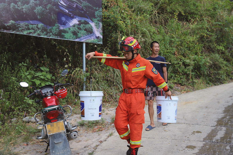 消防员为群众送水。