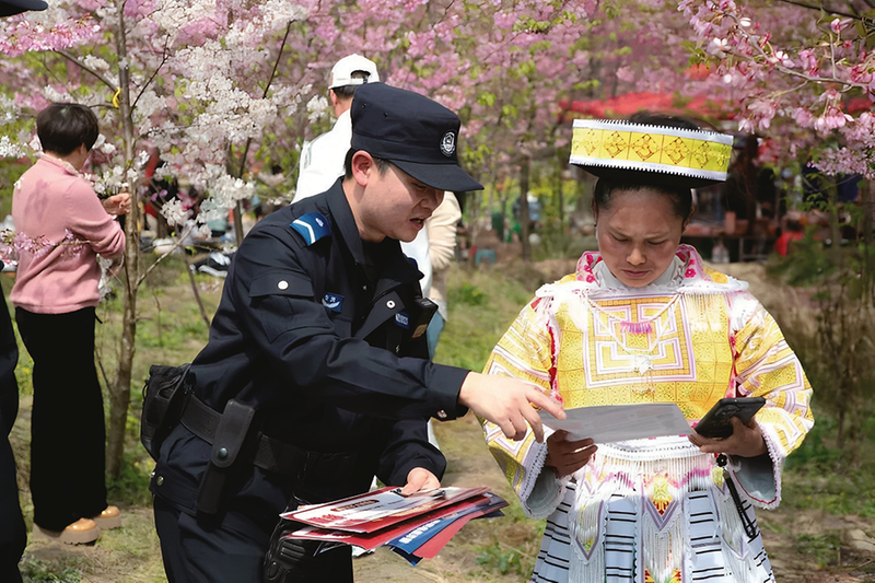 云岩区黔灵山公园内,红叶李繁花似雪,贴梗海棠艳红缀枝,紫玉兰端庄优雅,迎春花金黄满枝,来自各地的游客穿梭在花径间,不时驻足拍照、投喂猕猴,不亦乐乎。“来贵阳旅游,黔灵山公园是必来的地方,既能赏花又能看猕猴,还特别安全,随处都能看到民警巡逻,特别安心。”来自湖北的游客赵女士说。为守护这份惬意,云岩公安分局增派警力在公园入口、花径沿线、猕猴活动区域定点值守,疏导人流、排查隐患,提醒游客文明游园、注意安全,及时为游客提供路线指引、物品查找等服务,让游客在赏景之余无后顾之忧。