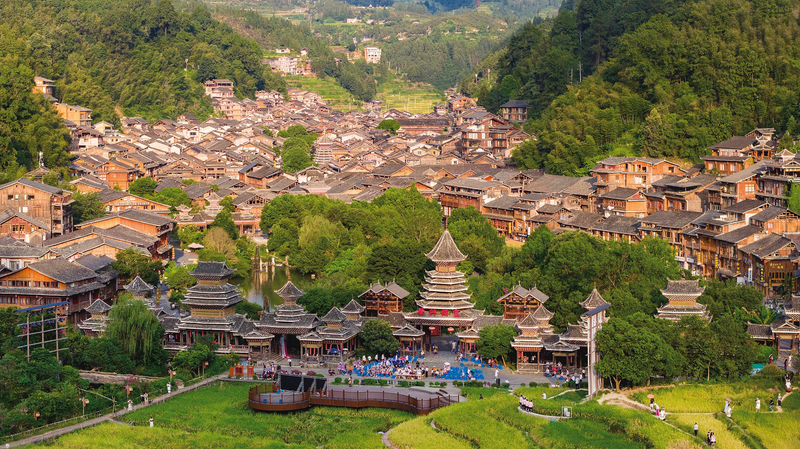 肇兴侗寨被誉为“侗乡第一寨”,是全国最大的侗族村寨之一。错落有致的吊脚楼、飞檐翘角的鼓楼群、悠扬婉转的侗族大歌映照出一幅和美乡村画卷,五座以“仁、义、礼、智、信”命名的鼓楼,与风雨桥、戏台共同构成侗族文化的核心标识。