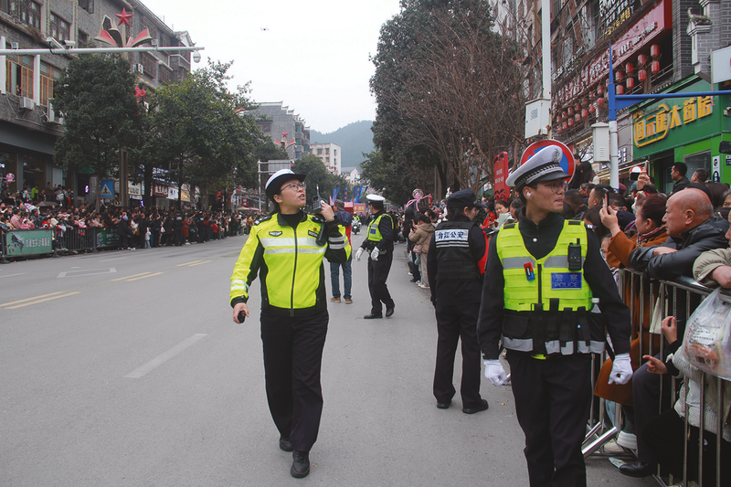 吴正琼(左)在侗年系列活动安保现场指挥调度。 ■ 记者 张永霞 通讯员 唐光新 黄长洲