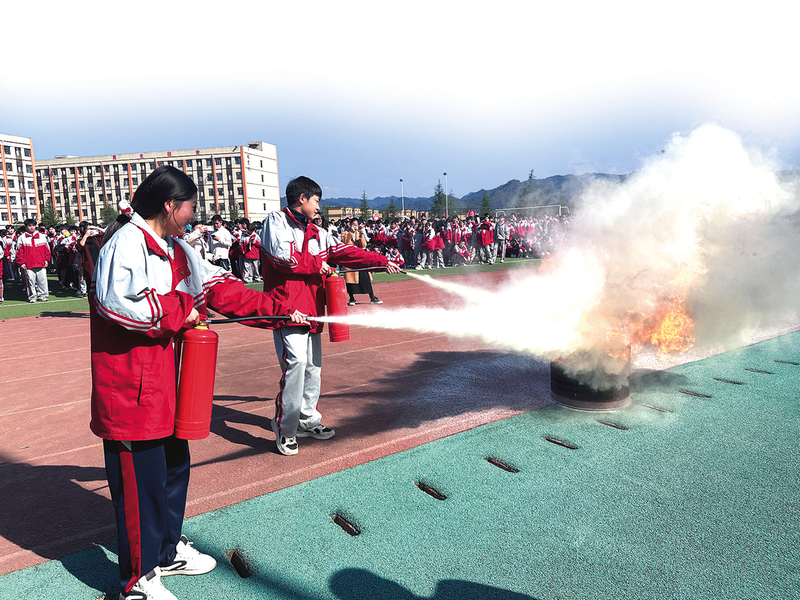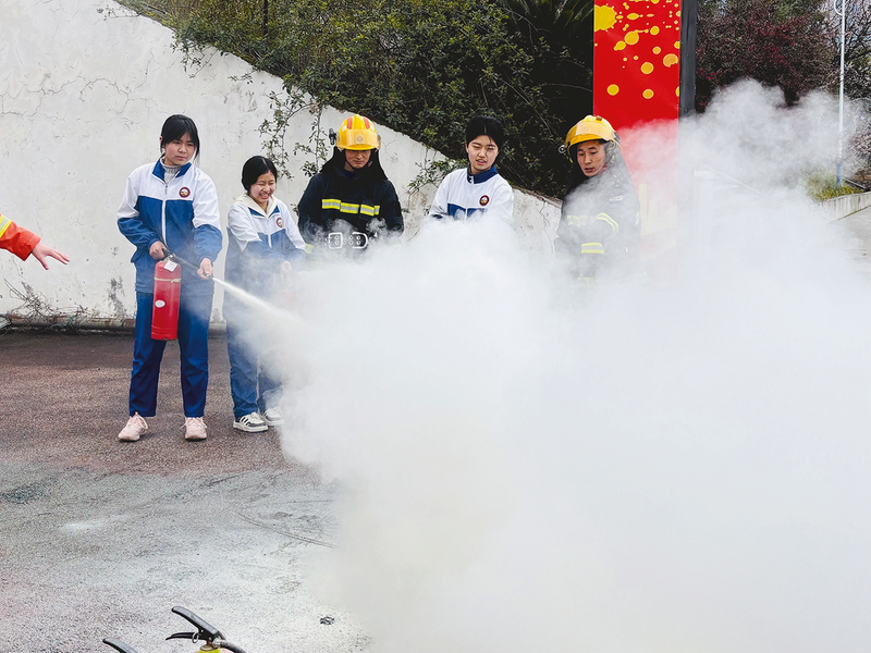 指导学生使用灭火器。通讯员 陈周 摄 ■ 记者 喻玉